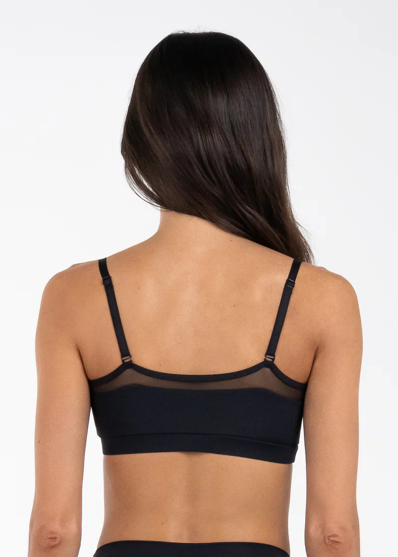 Top elaborado en tela suave y tul con copas triangulares sobrepuestas. Su contorno en espalda es ancho, por lo que brinda mayor cubrimiento en escote, sisa y espalda.